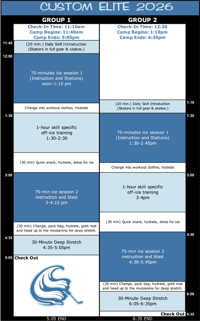 Custom Elite skaters are expected to behave, train, communicate, nourish, and hydrate like elite athletes. Our instructors COACH, they do not babysit. Custom Elite was designed for highly self-motivated travel players with the desire to play College/Pro hockey in the future. Custom Elite Camp is fun for players that crave hard work. It’s a miserable experience for players that don’t. If this is what YOU want for your skater, rather than what your skater wants, please don’t register. But if your skater is a hard working, hockey obsessed, and dreaming of a future in the sport… they are going to LOVE it!